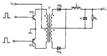 當接入電源后在R1給開關管VT1提供啟動電流,使VT1開始導通,其集電極電流Ic在L1中線性增長,在L2中感應出使VT1基極為正,發射極為負的正反饋電壓,使VT1很快飽和。與此同時,感應電壓給C1充電,隨著C1充電電壓的增高,VT1基極電位逐漸變低,致使VT1退出飽和區,Ic開始減小,在L2中感應出使VT1基極為負、發射極為正的電壓,使VT1迅速截止,這時二極管VD1導通,高頻變壓器T初級繞組中的儲能釋放給負載。在VT1截止時,L2中沒有感應電壓,直流供電輸人電壓又經R1給C1反向充電,逐漸提高VT1基極電位,使其重新導通,再次翻轉達到飽和狀態,電路就這樣重復振蕩下去。這里就像單端反激式開關電源那樣,由變壓器T的次級繞組向負載輸出所需要的電壓。自激式開關電源中的開關管起著開關及振蕩的雙重作從,也省去了控制電路。電路中由于負載位于變壓器的次級且工作在反激狀態,具有輸人和輸出相互隔離的優點。這種電路不僅適用于大功率電源,亦適用于小功率電源。推挽式開關電源的典型電路如下圖所示。它屬于雙端式變換電路,高頻變壓器的磁芯工作在磁滯回線的兩側。電路使用兩個開關管VT1和VT2,兩個開關管在外激勵方波信號的控制下交替的導通與截止,在變壓器T次級統組得到方波電壓,經整流濾波變為所需要的直流電壓。